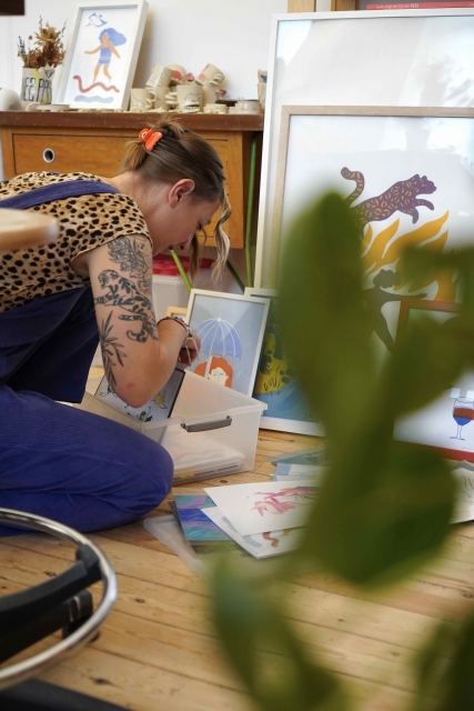 Dans son atelier de sérigraphie artisanale situé à Forest, elle développe une pratique qui se situe à la rencontre du dessin, de l’impression et de l’objet. Son travail se construit autour d’un trait sensible et de couleurs vibrantes, où les images prennent forme à travers différentes techniques d’impression et de fabrication.